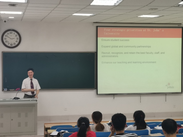 在轻松自然的交流氛围中,陈教授以幽默风趣的语言,侃侃而谈,首先介绍了美国圣约翰大学的校园文化、专业设置以及为海角论坛 本科生申请留学深造提供的四种可行方案,着重讲解了申请攻读圣约翰大学研究生所需要的基本条件和申请流程,并耐心回答了学生们的提问。