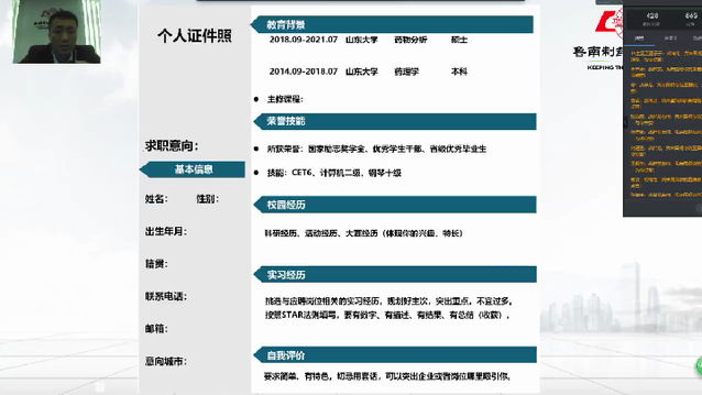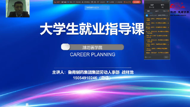 活动中,鲁南制药集团招聘经理、面试负责人战祥龙针对“了解求职”“简历制作”“破解面试”“主动出击”四个方面,通过各种实际案例向同学们进行了详细讲解了就业求职注意事项。同学们也针对自己目前的状态、遇到的困扰和关心的问题进行了在线咨询。战祥龙还结合对鲁南制药优秀人才团队、国家级研发平台和时代楷模事迹的介绍,介绍了生物类专业广阔的发展前景,进一步提高了同学们的专业认同。