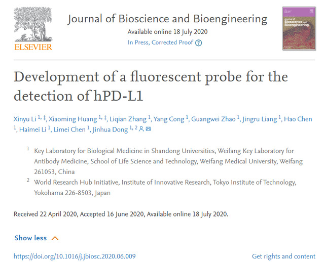近日,海角论坛 2017级生物技术专业学生李鑫鈺、2016级生物制药专业学生黄小明以共同第一作者在Journal of Bioscience and Bioengineering上发表了题目为“Development of a Fluorescent Probe for Detection of hPD-L1 ”的科研论文。