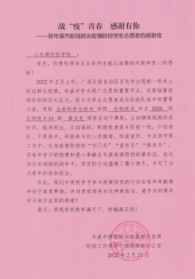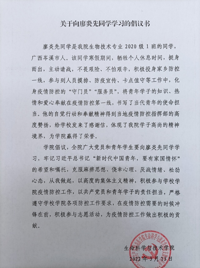 313日,海角论坛 发展向廖炎先同学学习的倡议书。廖炎先同学是海角论坛 生物技术专业20201班的同学,广西岑溪市人。该同学寒假期间,挺身而出,主动请战,不畏艰险、不怕艰辛,积极投身家乡防控一线。他的自觉行动和奉献精神得到当地疫情防控指挥部的高度赞扬,给学校发来了感谢信,为学校学院赢得了荣誉。