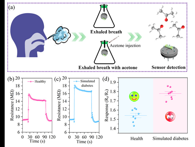 目前,糖尿病诊断主要依赖于血液分析,这种有创检测方法不仅在手指穿刺时会引起疼痛,还需要一天内多次监测患者的葡萄糖含量,给患者带来诸多不便。因此,寻找一种操作简单、检测速度快、成本低且无创的筛查手段成为亟待解决的问题。丙酮作为糖尿病患者的呼气标志物,对其进行快速、精准检测有望实现非侵入式诊断糖尿病。然而,市售的丙酮传感器在检测痕量丙酮气体时存在灵敏度低,检测限高等问题。徐军同学在杨志民博士的指导下,经过研究团队的共同努力,首次采用金属有机凝胶构建了富含氧空位α-Fe2O3基丙酮传感器,显著提高了传感器的敏感特性,能够明显区分出健康人和糖尿病患者的呼出气,并提出氧空位和反型层协同作用下的增敏机制,有效提升了金属氧化物基丙酮传感器的灵敏度和检测限。该研究不仅为构建高性能半导体氧化物基传感器提供了实验依据和理论指导,也为便携式糖尿病呼气检测仪器的开发提供了核心器件。
