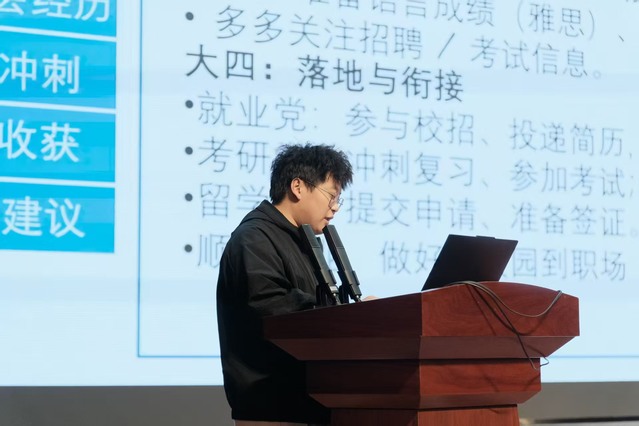 马成系统阐述了自己从大学初期探索到毕业阶段冲刺的完整发展路径。他强调“学业乃立足之本”,建议同学们要明确核心目标,聚焦专业发展。在考研备战方面,他提出应理性看待备考过程中的不足,通过正向激励机制与科学放松,保持稳定的心理状态。